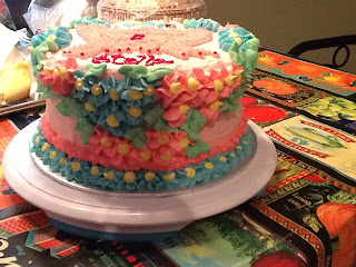 I took a workshop Saturday on building stacked and lifted tier cakes. Lots of good info and techniques. These babies have some weight so it takes engineering to get them up and keep them up! After the lecture we had about two hours to assemble our own terrifying tower of cake. After a frenzy of activity........ta da!